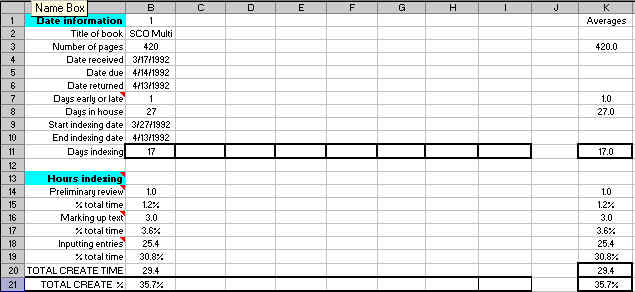 The Index Management Tool is a 30KB Excel spreadsheet that lets you track the tasks required in producing an index. Using this tool, you can track the time, money, and perishables used for each of your indexing projects. It keeps a running total for each project plus an average for all projects entered. This is a great tool to manage your indexing process.