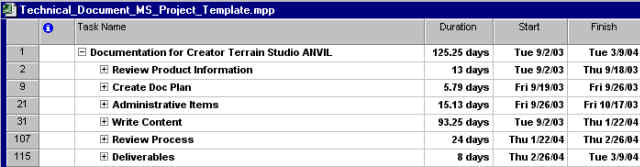 Please email Larry if you want this Microsoft Project file (432KB Microsoft Project format) that has the basic tasks and subtasks required for a documentation project. You can open it and start entering your data and you will be managing your project in a few minutes.